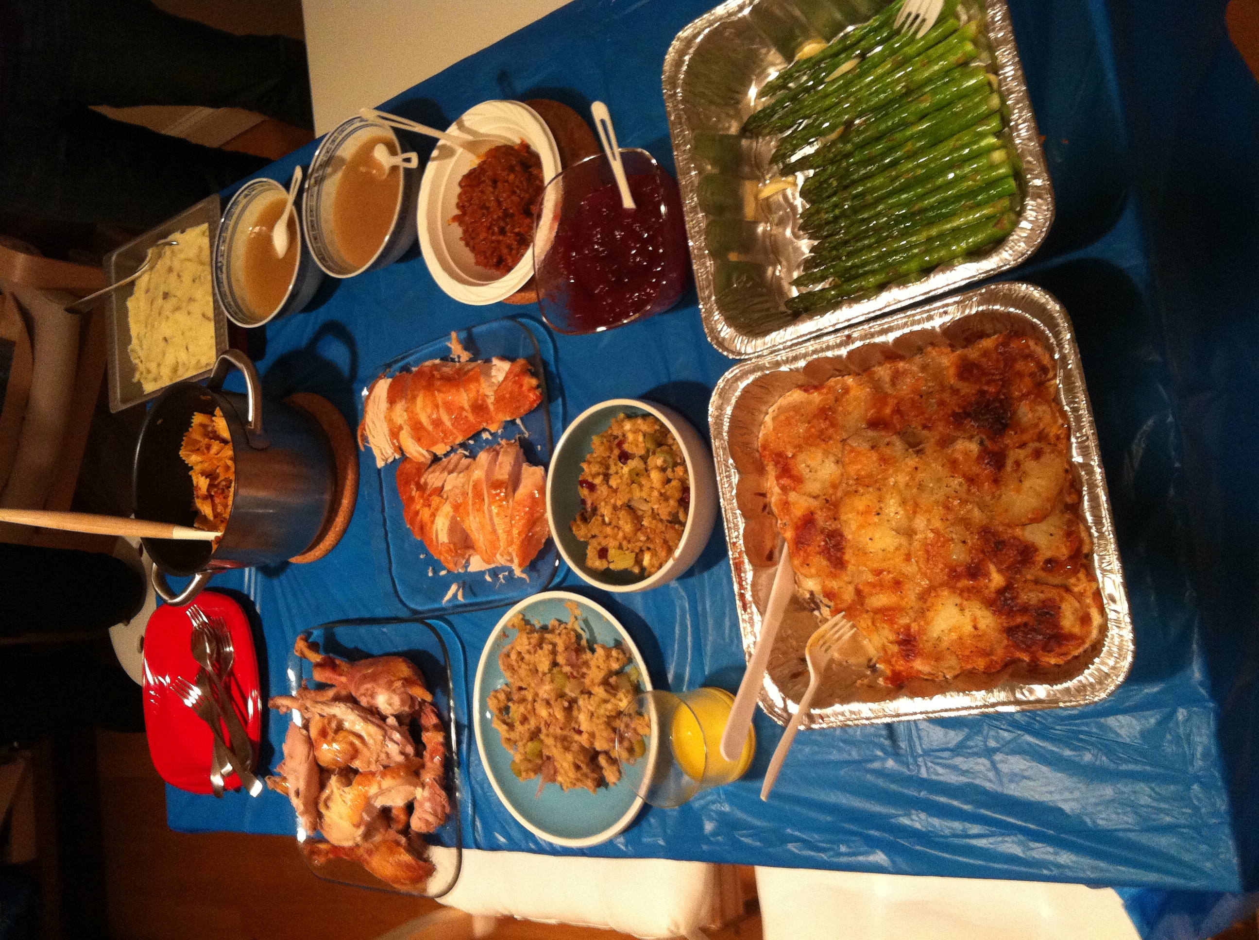 stuffing, turkey, mash potatoes, pasta, gravy, potatoes, asparagus, nom nom